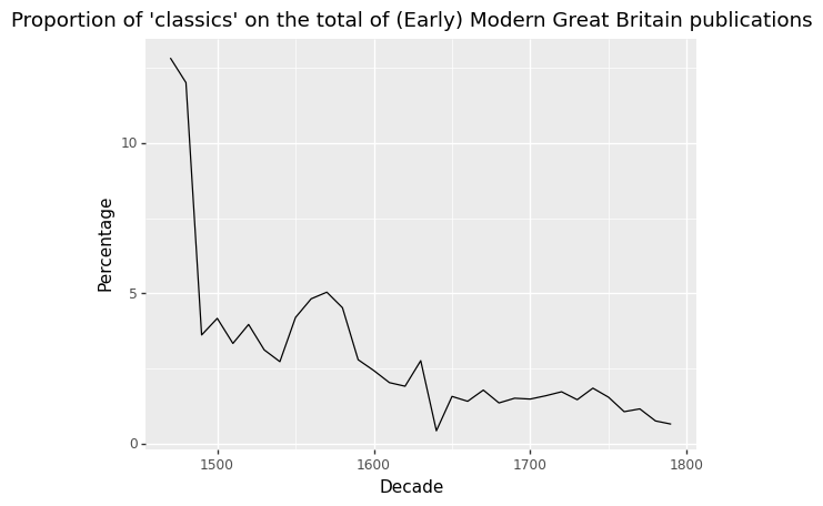 This growth, however, largely results from the growth of book printing in England. When normalized against the total number of ESTC publications per decade, the proportion of Classics publications actually decreases from the 16th to the 18th century, as visible in Figure 2.