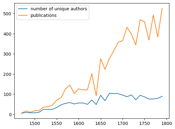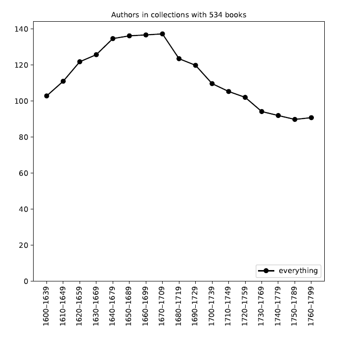 Despite a growth in the total number of publications, a diachronic analysis of the number of different authors published per year shows that initially it correlates with the increase in the number of publications, but in the second half of the seventeenth century it stabilizes (Figure 3).
