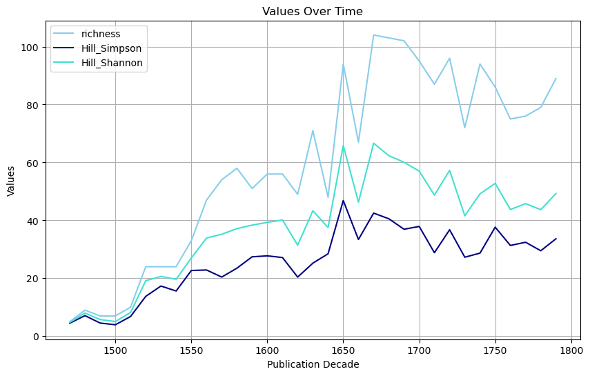 Richness: already visualized in Figure 3 (blue line), simply counts the number of different authors published every decade. This measure has several drawbacks, the most important being the fact that it is highly sensitive to sample size. Since in our case the amount of books per decade significantly increases over time, the change in size impacts the results.