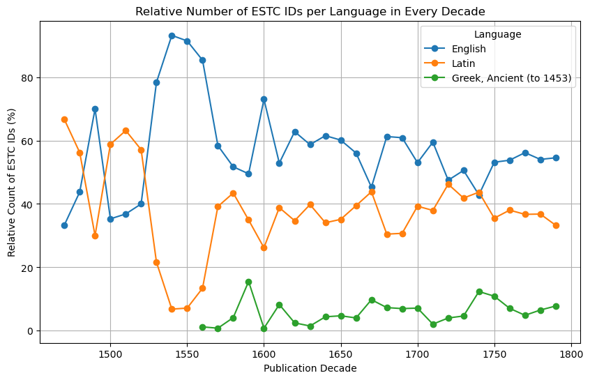Subsequently, the classical authors’ IDs were mapped to the corresponding works, and from there to their EEBO and ECCO identifiers, which are used for Section 4. No text-mining was carried out on the titles of the works. As a consequence, the records are mostly editions and translations of ancient authors. Monographs and commentaries on ancient authors are rare in the dataset. An example is the work “Aristarchus Anti-Bentleianus quadraginta sex bentleii errores super Q. Horatii Flacci odarum libro primo spissos nonnullos, et erubescendos” by Johnson Richard. Since ESTC does not list Horace as an author, it is rightly excluded from the database. Unsurprisingly, however, our data retrieval reflects some inconsistencies in the ESTC metadata. For instance, for the book titled “A modern essay on the tenth satyr of Juvenal” (ESTC ID: R22431), Juvenal is listed as an author by ESTC, against its general policy. For consistency, in this paper we refer to the ESTC records associated to Ancient Greek and Latin authors as “classical editions”, or “editions of classical authors”. One ESTC ID corresponds to one edition (and not to one extant copy) of a work, and for multi-volume editions the same ID is assigned to all volumes. “Editions” in our usage include both texts in the original language and translations. A distinction between the two categories is made in Section 4. When multiple ancient texts are published or translated in a single work, the classical authors often remain anonymous, for instance in the work “Poetical translations from the ancients. By Gilbert Wakefield, B.A” (ESTC ID: T98000), where only Wakefield is mentioned as author. On the other hand, when classical authors have been listed in the ESTC “actors” database, they have been retrieved. An example is ESTC ID R21069, “Miscellany poems in two parts: containing new translations out of Virgil, Lucretius, Horace, Ovid, Theocritus, and other authours: with several original poems by the most eminent hands / published by Mr. Dryden”, where the five Latin authors are listed. There may, however, be inconsistencies in annotation on this level as well. Moreover, anonymous works are potentially not retrieved with this approach. To account for these, we exploited the Trismegistos Authors database, that lists “Anonymous authors” up to the 8th century. A manual check of the main entries revealed that the works had effectively been retrieved, because they were assigned to a ‘fictitious’ authors in the ESTC10. Hence, the impact on the total results should be minor11.