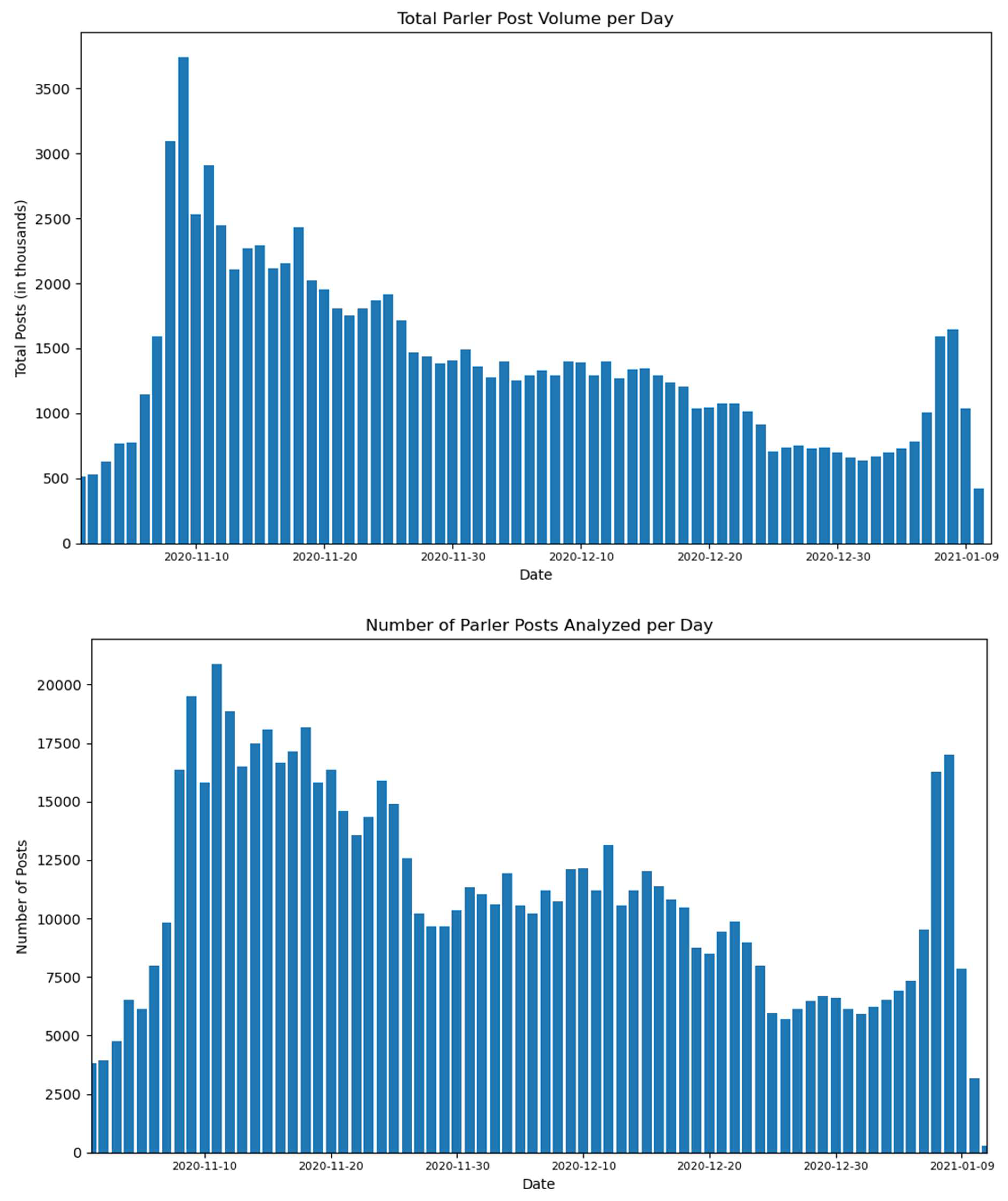 Because we were interested in the daily change of the narrative frameworks, we binned the posts by day. The number of posts per day on Parler varied greatly over the course of our study period, with the highest volume occurring on November 9, 2020 (3.74M posts) and the lowest volume occurring during the earliest days of November as well as the last day Parler was online (419k), with an average of ~1.295M posts per day (Fig. 1). Unfortunately, this volume was significantly greater than what our computing resources could handle.4 Consequently, we randomly sampled 10% of usable posts in each daily bin, with 2,000 usable posts per day as a minimum threshold; we also added all the usable posts from January 11 to the final day’s graph. This process created 72 bins consisting of 783,021 posts, with an average of 10,876 posts per day (range of 3176 to 20,890).