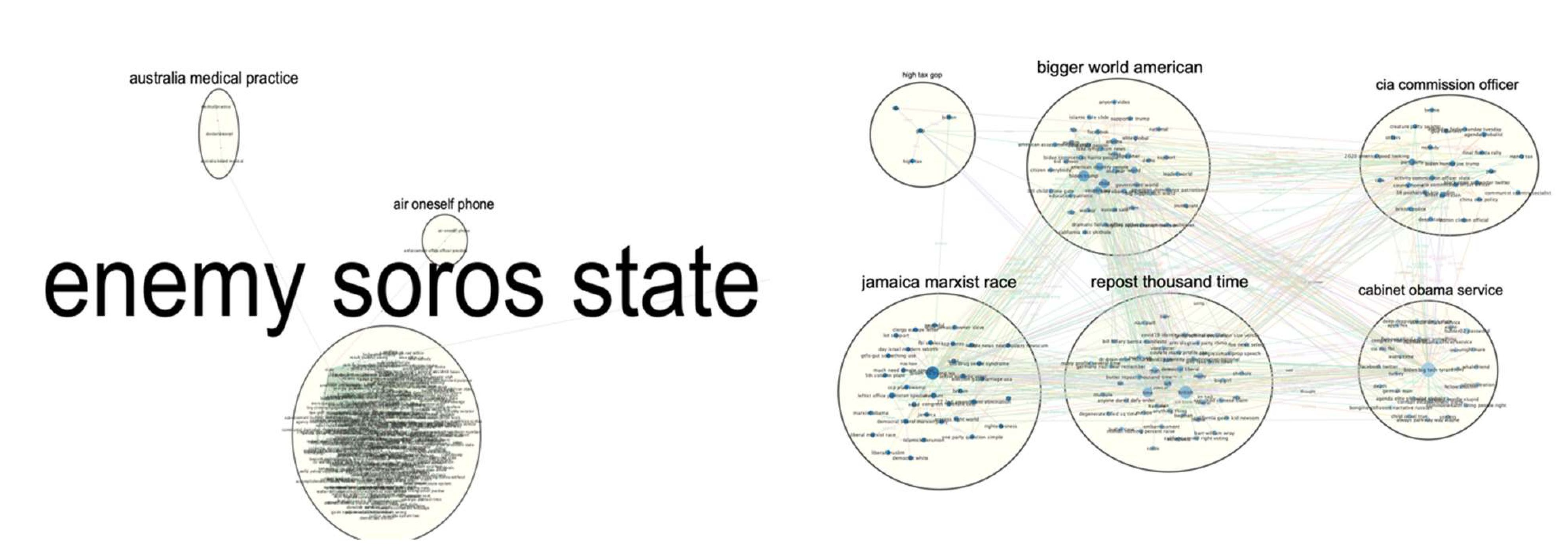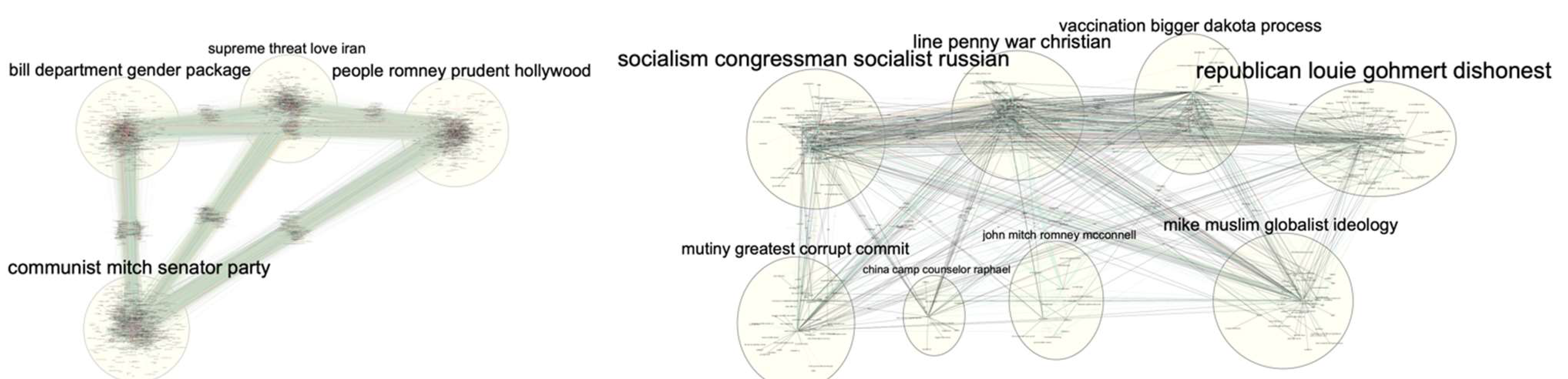 Ivy league professors and other left wing actants are connected through edges with the topics “communists” (2) and “Pelosi” (4) to treasonous politicians in the “Hunter agenda soul Obama” cluster, while the Antichrist cluster is linked through “swamp” (0) and “Communist” (2) edges to Dominion and ballot stealing in the main Sydney Powell cluster. In contrast, the “Helping patriot police” cluster, with a prominent “Trump martial law” node is connected by edges in the “Barr” topic (22) to supportive nodes such as “Republicans” in the “democrat mass communist” cluster and Kyle Rittenhouse in the “socialist online harmful” cluster. This pattern of specific topic edges between subgraphs repeats itself across all our decompositions and lends support to the hypothesis that these narrative subgraphs are connected through edges, largely encoding verb phrases, that are dependent on ideologically motivated interpretations of events or other forms of speculation.