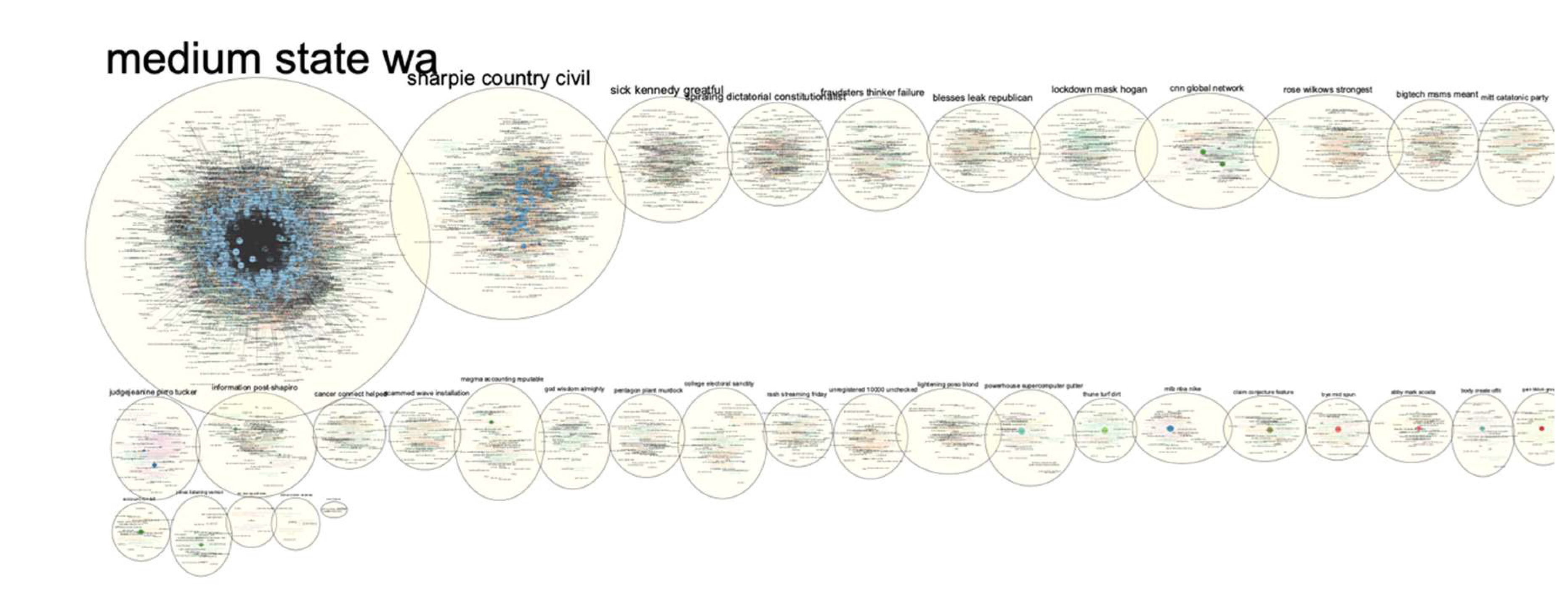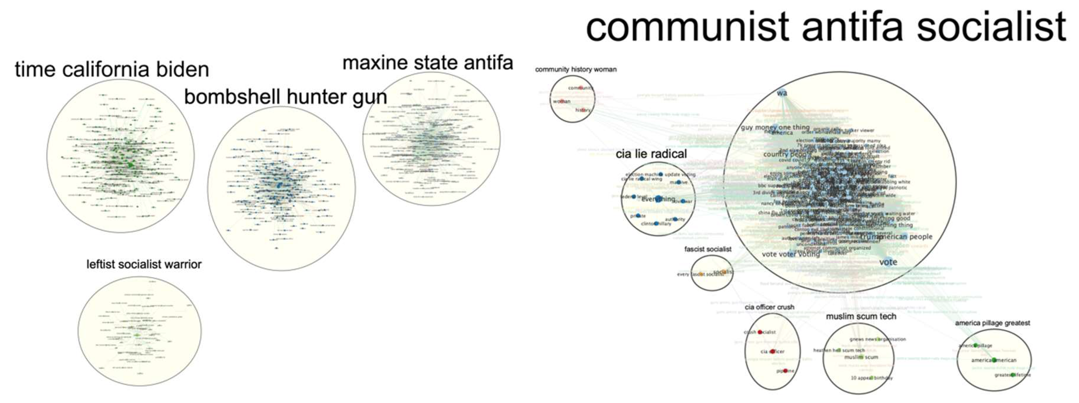 In the subsequent bins the narratives become more elaborate, yet the core remains largely the same (Fig 9). The main narrative community in these bins consistently focuses on deep state actors and their machinations to deny Trump’s election. Patriots, family and God are strongly arrayed against these forces, while secondary narrative clusters generate the broad conspiracy theories of globalists, Hunter Biden and his corruption, the role of the Chinese Communist party, and a strong socialist/anti-Americanism among Democrats.
