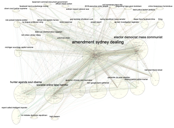The results of our multi-stage NLP and graph analytic approach provide a clear mapping of the range of discussions on Parler and reveal how these discussions rest on a single narrative framework. The broad contours of this narrative framework propose that the results of the election were fraudulent, with the deception orchestrated by globalists, Democrats and a vast conspiracy of fundamentally corrupt deep state actors and motivated by self-serving anti-Democratic impulses (the swamp), whose goals were to enrich themselves, undermine Christian values, erode the bulwarks of democracy and destroy a society built on law and order. As such, it is redolent of a comprehensive, totalizing conspiracy theory. A consensus developed that the best strategy to deal with this existential threat was to block the certification process “by any means necessary.” Thus, parallel to the thicket of posts that constructed, elaborated and confirmed the conspiracy theory of “Demonrats” working with globalists and the Chinese Communist Party to steal the election, were numerous posts planning a violent insurrection on Capitol Hill, using BLM/Antifa protests as a model, and using terms such as “peaceful protest” in a deliberately ironic manner.