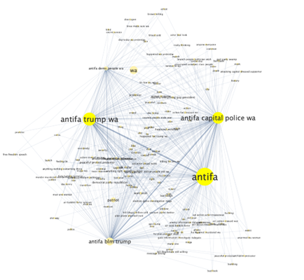The graphs from the final bin stand as an outlier, as they include real-time posts from the insurrection as well as posts made in its immediate aftermath. In the days after the insurrection, the antagonistic BLM/Antifa narrative components are flipped on their head, with the violence at the Capitol being blamed in large part on infiltrators from these movements. In one Antifa focused cluster, the role of Antifa, possibly in collusion with the Capitol police and the “dems” overwhelm the patriots and supporters of Trump (Fig 12).