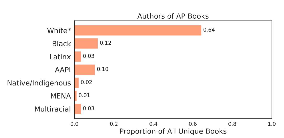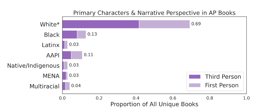 School curricula represent kinds of historical and cultural knowledge that society prioritizes and codifies at certain historical moments. Designed to prepare younger generations for life and career (Tedesco et al. 10), its contents can shape students’ values, beliefs, and identities. In the US, English Language Arts (ELA) teaches literary and writing skills to students, typically through the study of assigned texts. These texts—poetry, plays, articles, and especially novels—are focal points of curriculum, around which educators organize skills and conceptually-based lessons. These texts influence not only students’ understanding of themselves, but also their sociocultural understanding of others (Dee and Penner). In particular, racial/ethnic representations in these literary texts matter for students’ self-affirmation and prejudice reduction (Bishop 3; Banas et al.). In this paper, we quantify the racial/ethnic representation of authors and characters in nearly four hundred books taught in American high schools between 2019 and 2023, to consider what kind of sociocultural knowledge ELA has promoted in the US. If book bans in the US have disproportionately impacted children’s books by authors of color and books that feature characters of color, how does literature teaching in the US approach minoritized racial and ethnic groups (Goncalves et al.)?