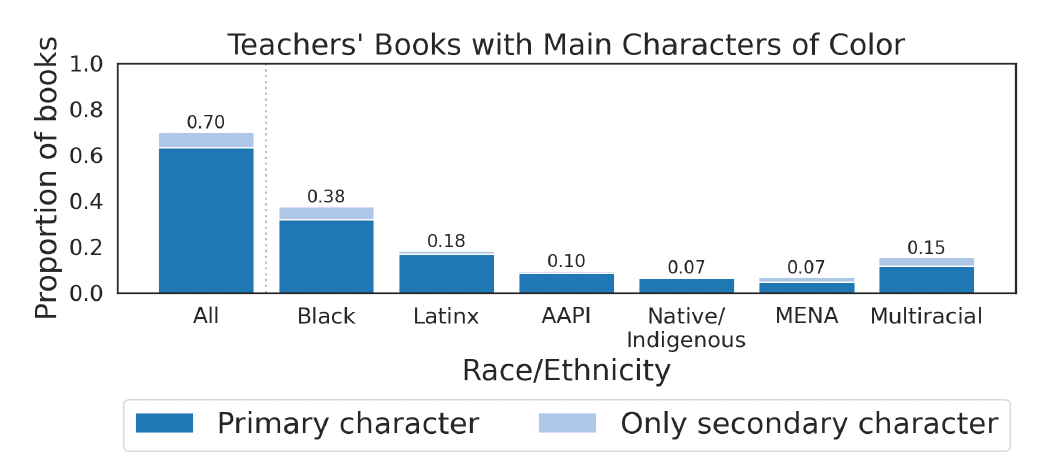 Across both ELA datasets, eighty-seven books include White main characters with main characters of color, and only 8 books include main characters of color from distinct backgrounds, e.g. the MENA and Latino/a/x main characters in Spare Parts, a book listed by two teachers. We find that it is more common for primary characters of color to appear with White secondary characters (58.6% of interracial books, 40.2% of all books with primary characters of color) than vice versa (41.4% of interracial books, 19.8% of all books with White primary characters). This difference is analogous to patterns in the physical world: White people across the US tend to be in more racially homophilic schools and communities compared to people in other racial groups (Schaeffer; Vachuska; Goddard).