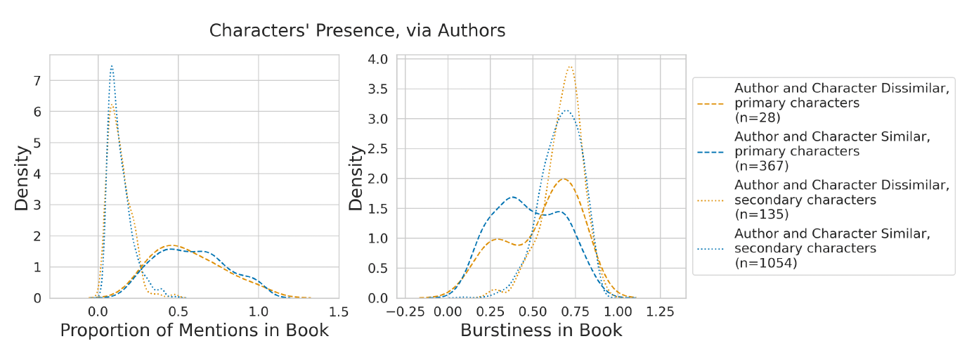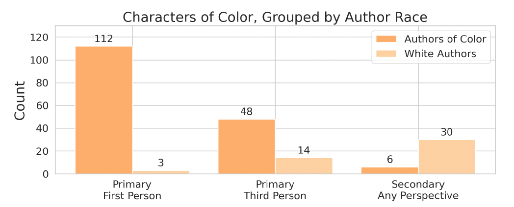 - Visually, these distributions persist even if we separate out the cases where White authors write about primary characters of color from those in which authors of color write about White primary characters. Due to too low sample sizes for statistical significance testing, we grouped these two cases under an aggregated “authors and characters are dissimilar” sample. ⮭