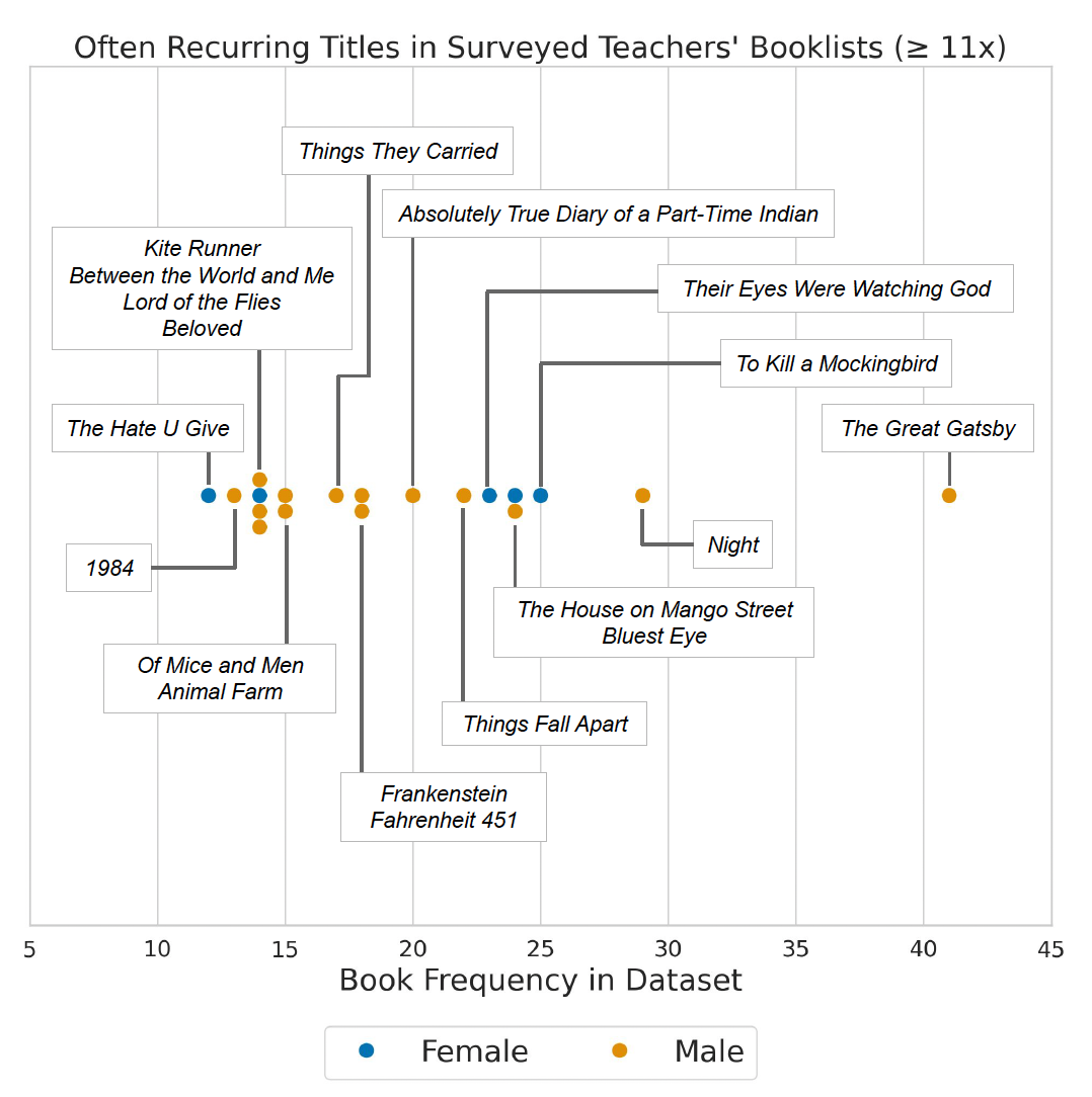 The teachers in our case study are not necessarily representative of teachers nationally, and our sample here spans a much shorter time frame than AP’s. Therefore, the recurrence of titles within this dataset may be less indicative of a pervasive canon than recurrences in AP Literature. Still, some scholars, such as Manshel and Chiang, have suggested revising definitions of canonicity to go beyond the notion of a single canon unyielding to time; for instance, individuals may craft their own “personal canon” (Dalleo and Sáez 1). Titles with widespread use among the teachers in our study suggest the formation of alternative canons to the one imposed by AP (Figure 9). Popular titles include older “classics” by White authors such as The Great Gatsby (1925), To Kill a Mockingbird (1960), and Animal Farm (1945), but also newer books by authors of color such as The Hate U Give (2017) and The Absolutely True Diary of a Part-Time Indian (2007). These latter two titles do not appear in AP exams up to 2021 and suggest existing ways in which US teachers may deviate from AP. In fact, a majority (68.7%) of books that appear in this teacher-provided dataset but not in AP Literature feature primary characters of color. Still, the gender gap among recurring titles in Figure 9 is large, where only 5 of the 19 titles shown feature female primary characters (Appendix 13). Overall, the two ELA datasets in our study present distinct snapshots of how literature may be taught in the US, and together, provide concrete possibilities around what types of books and characters could be taught in classrooms.